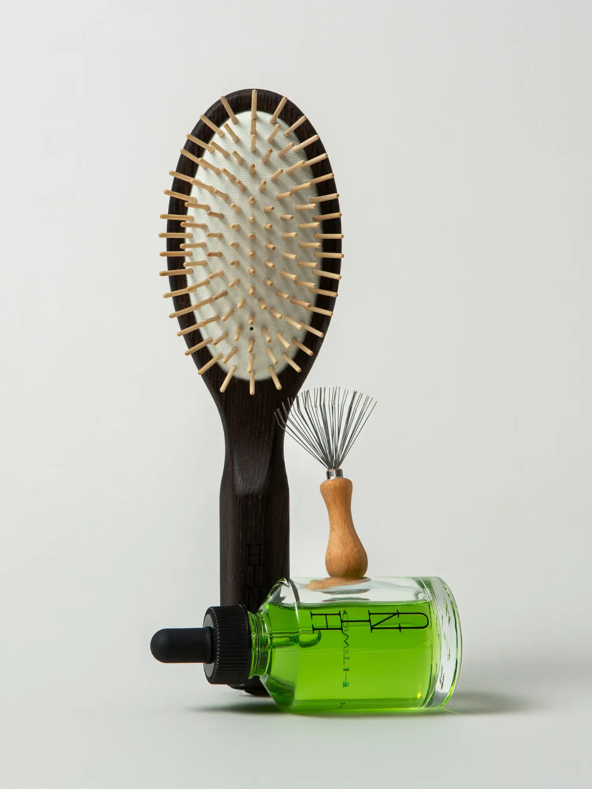 Includes the 60ml Hair Growth Oil, Wooden Hair Brush, and Brush Cleaner to care for both your hair and your tools.