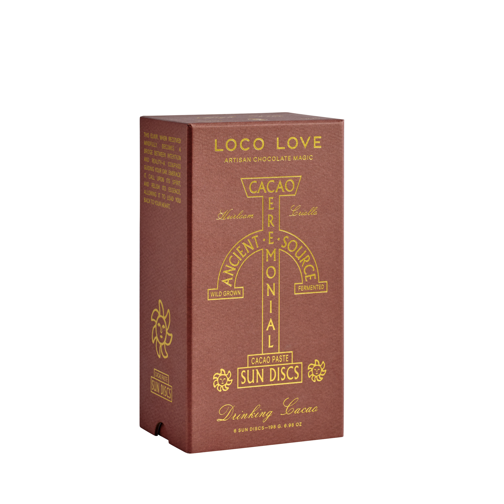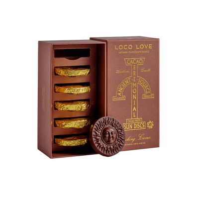 Gold Sun Discs of 100% pure wildcrafted Chuncho Urushayhua cacao. Used as a delicious and potent elixir, this strain of cacao is scientifically recognised as the most aromatically rich in the world. More than just a drink; this sacred plant medicine is revered for its heart-opening and grounding properties. Consumed daily, this elixir offers a gentle yet powerful alternative to coffee, with benefits ranging from enhanced focus and mood. The sun represents an ode to light.